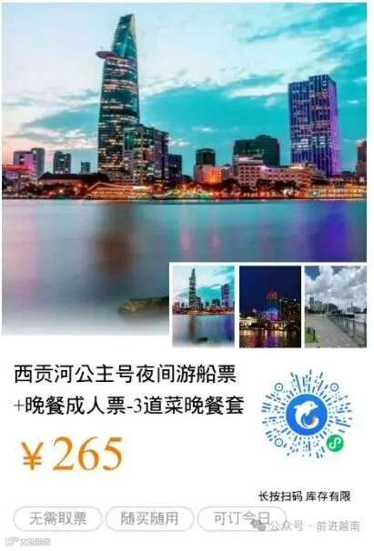 游船晚餐:码头边有很多提供夜游服务的游船。票种通常包含晚餐(自助餐居多)和船上的音乐表演。船缓缓驶离喧嚣,你可以在甲板上吹着河风,一边享用晚餐,一边欣赏两岸的城市灯光与地标建筑(如Landmark 81)的璀璨夜景。