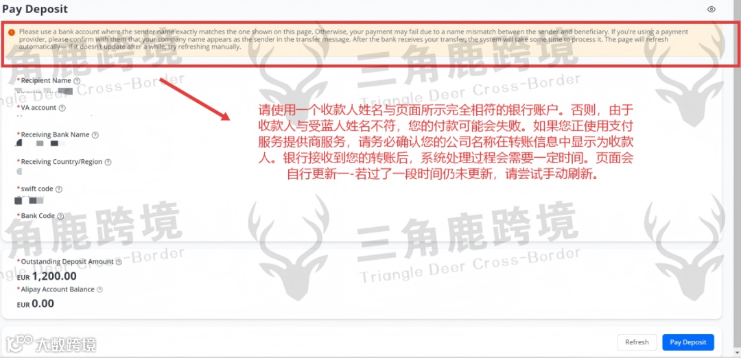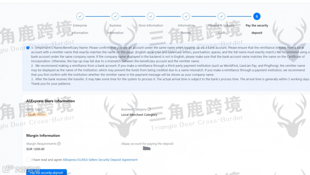 在三角鹿实操过程中发现速卖通要求卖家通过公司对公银行账户进行保证金缴纳。在缴纳时,确保你的银行账户姓名与页面上显示的收款人姓名一致。如果你通过第三方支付平台支付,记得确认公司名称要出现在转账信息中,这样才能顺利完成支付。