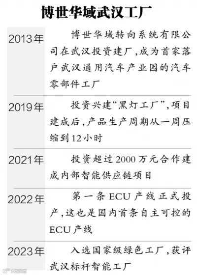 2013年底,由德国博世集团和上汽集团两家世界500强企业共同投资设立的博世华域转向系统有限公司在武汉投资建厂,博世华域武汉工厂成为首家落户武汉通用汽车产业园的汽车零部件工厂。