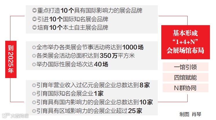 《方案》提出,重点打造10个具有国际影响力的展会品牌,引进10个国际知名展会品牌,培育10个本土自主展会品牌。争取通过UFI(国际展览联盟)认证的项目超过6个。到2025年,引育年营业收入过亿元会展企业总数达到8家,引育国际知名会展企业1家,引育具有国内影响力的会展企业总数达到10家,引育具有区域影响力的会展企业超过25家。争取获得UFI和ICCA(国际大会及会议协会)国际组织会员认证的企业数量超过20家。