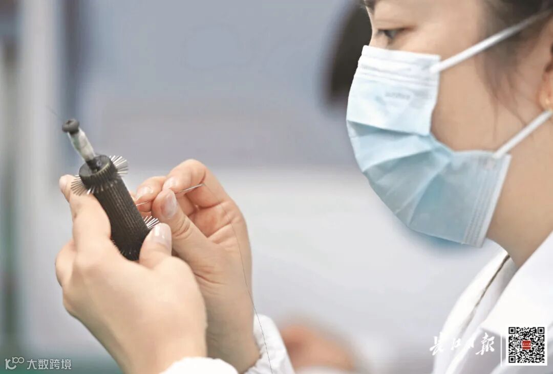 唯柯医疗工作人员用钢针穿引头发丝般的镍钛合金丝在磨具上编织心房分流器。