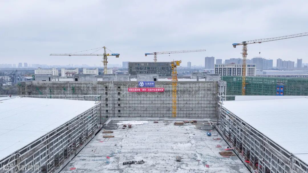 12月12日,在黄陂区滠口街道,随着六号冷库的最后一块彩钢板铺装结束,玉湖冷链(武汉)交易中心(以下简称“玉湖冷链武汉项目”)全面封顶,项目转入装饰装修和设备安装阶段。