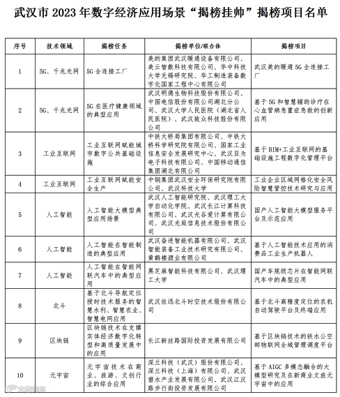 近日,武汉发布2023年数字经济应用场景“揭榜挂帅”十大项目。今年,10个“揭榜挂帅”项目涉及5G、千兆光网、工业互联网、人工智能、北斗、区块链、元宇宙等技术领域。