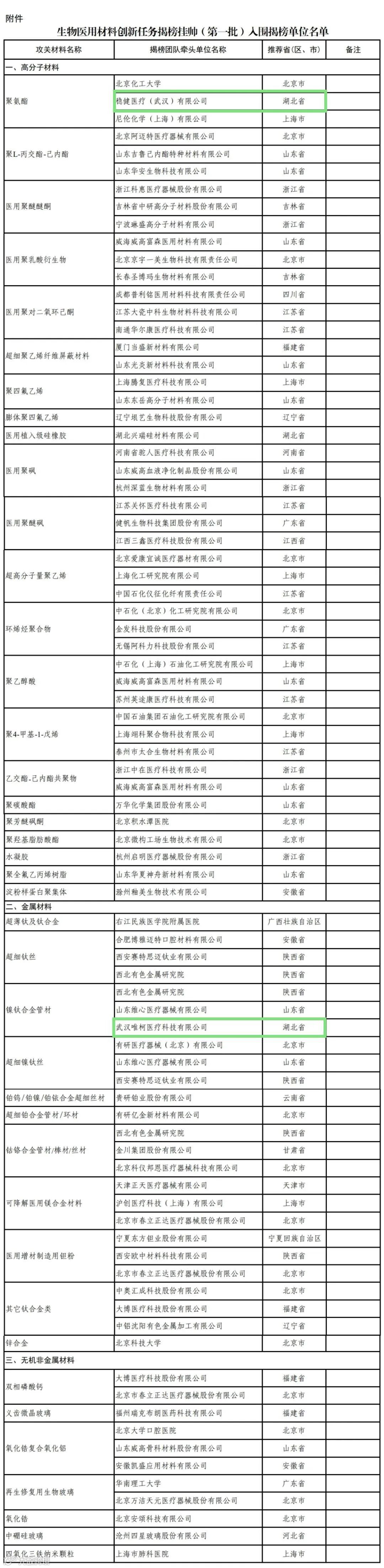2023年生物医用材料创新任务揭榜挂帅(第一批)任务榜由工业和信息化部、国家药品监督管理局联合组织开展,聚焦高分子材料、金属材料、无机非金属材料三大重点方向,经各地推荐、综合评审和网上公示,确定了入围揭榜单位名单,湖北入围的三家企业有两家在武汉。