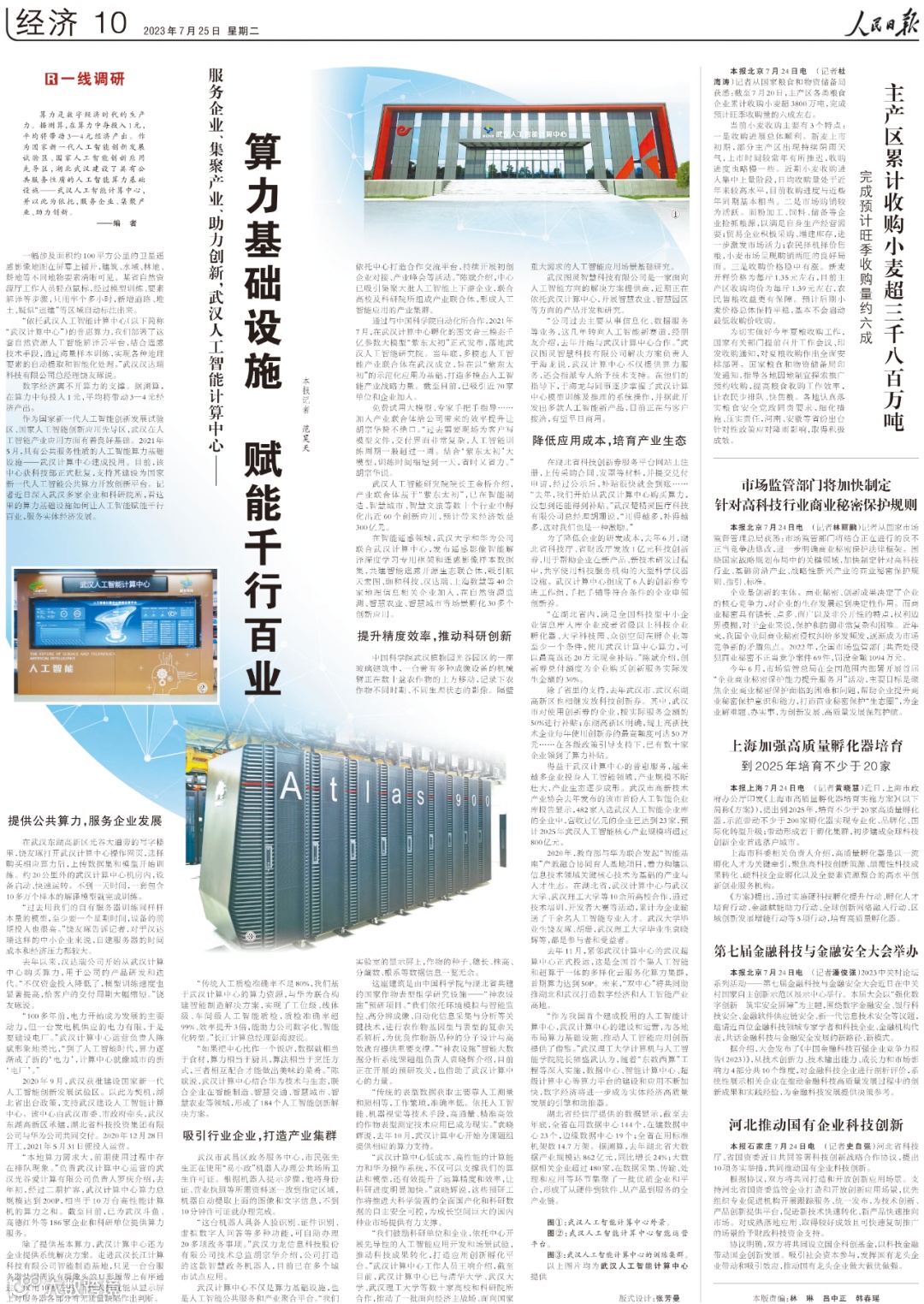 7月25日,《人民日报》刊发报道《服务企业、集聚产业、助力创新,武汉人工智能计算中心——算力基础设施 赋能千行百业》,以下为全文转载: