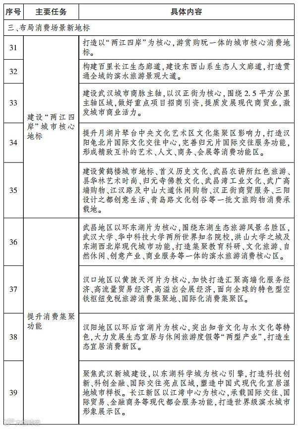 武昌地区以环东湖片为核心,打造滨水旅游消费核心区。汉口地区以黄陂天河片为核心,加快打造面向全球的特色型空铁枢纽免税旅游消费集聚地、国际化消费集聚区。汉阳地区以环后官湖片为核心,打造生态宜居消费新区。