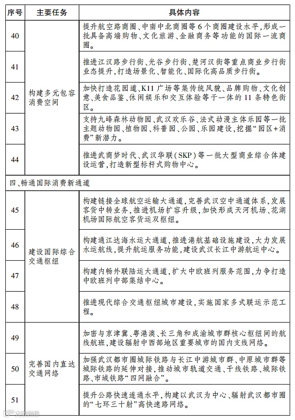 建设国际综合交通枢纽。构建链接全球航空运输大通道,完善武汉空中通道体系,发展客货中转业务,推进机场扩容升级,加快形成天河机场、花湖机场国际航空客货运双枢纽。