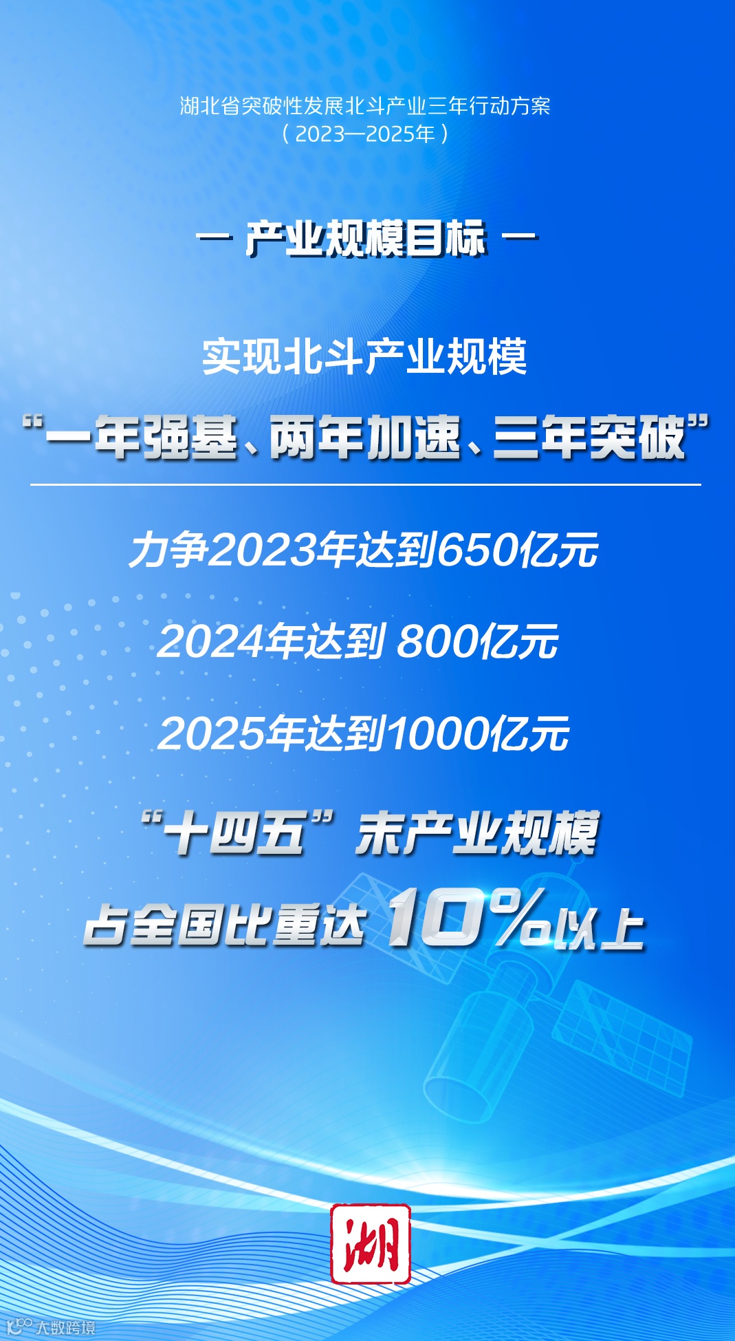 《方案》提出,实现北斗产业规模“一年强基、两年加速、三年突破”,力争2023年达到650亿元、2024年达到800亿元、2025年达到1000亿元,“十四五”末产业规模占全国比重达10%以上。
