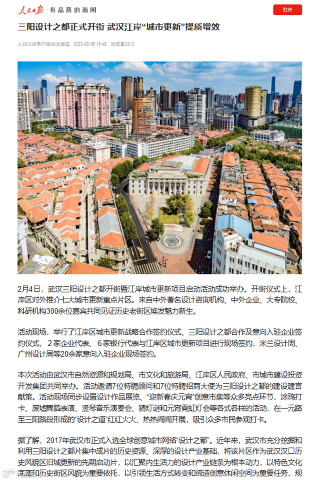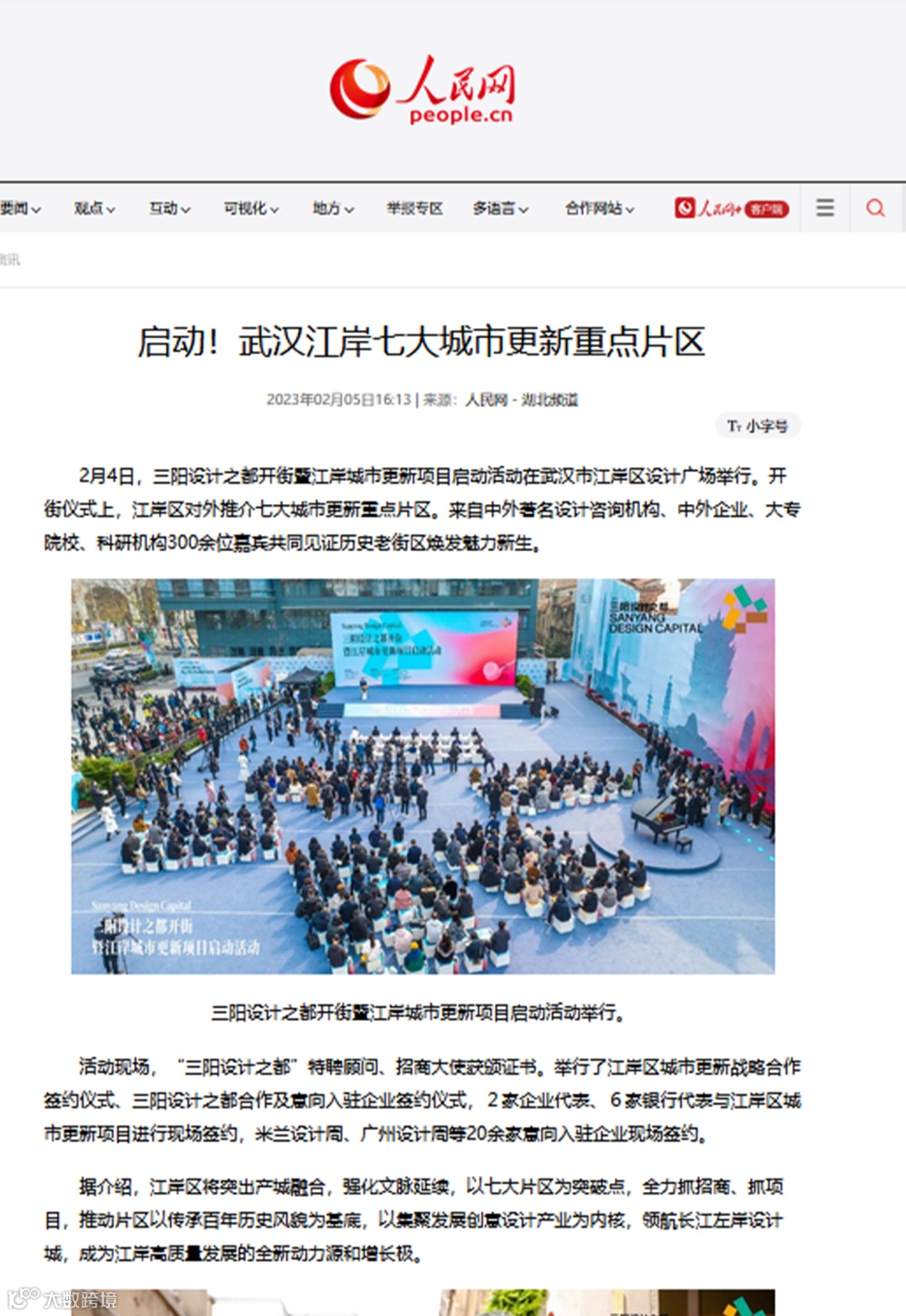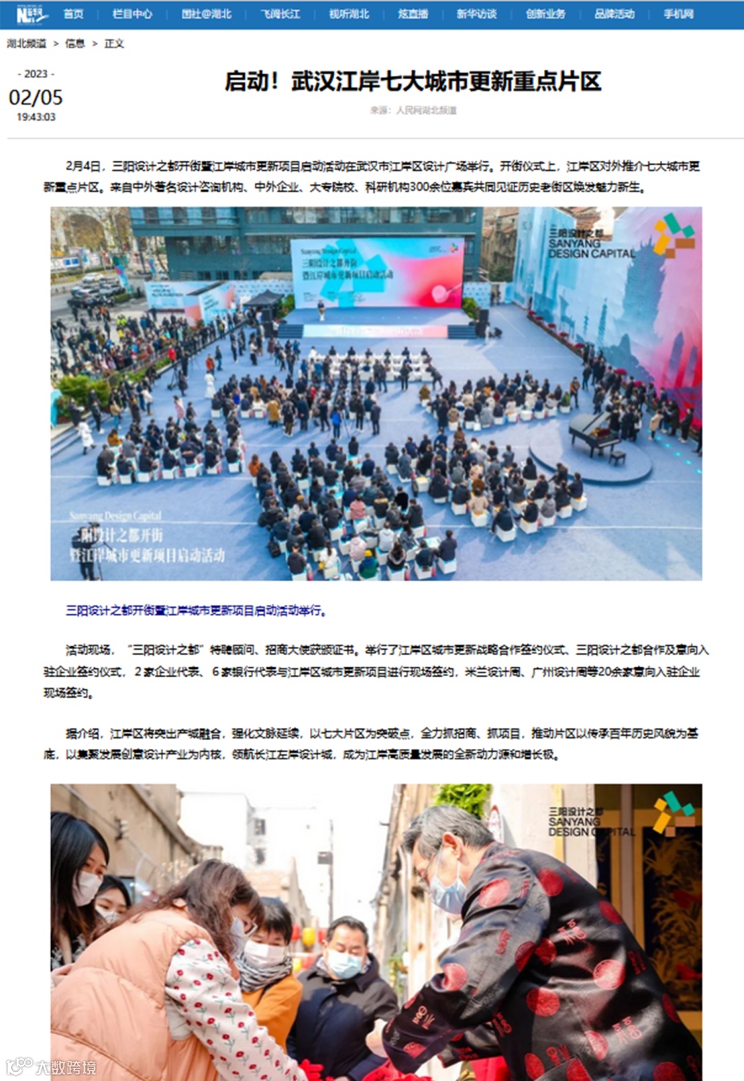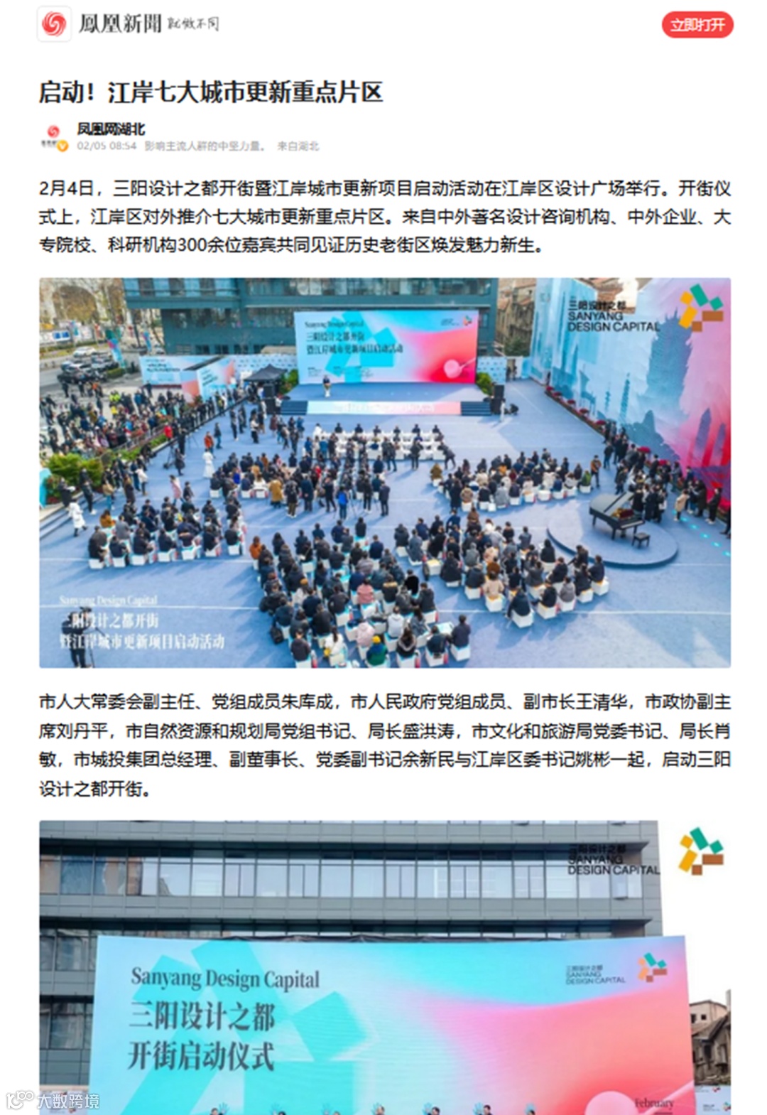江岸七大城市更新重点片区亮相、多家企业现场签约、老里分众多游客打卡拍照……2月4日,三阳设计之都开街暨江岸城市更新项目启动活动,在江岸区设计广场成功举办,获人民日报、新华网、人民网、央广网、中新网、国际在线等中央级媒体全国推介,湖北日报、长江日报头版重点报道,荆楚网、长江云、武汉发布、今日头条、凤凰、新浪、腾讯、百度等新媒体平台全网发布。