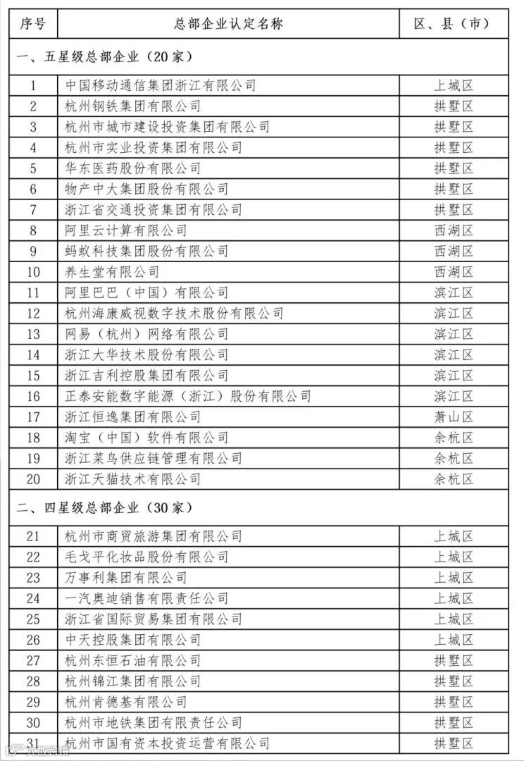 根据综合评价,杭州评定五星级总部企业20家、四星级总部企业30家、三星级总部企业50家。而根据总部企业营业收入规模,杭州评定“百亿级”以上总部企业共88家,数量较上年度增加5家。其中,“千亿级”总部企业达到11家。