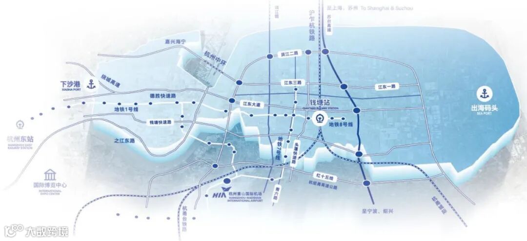 钱塘地处杭州湾地理中心,“一带一路”、长江经济带、长三角一体化发展三大国家战略在此交汇,拥有“空轨路铁”四线联动的交通体系,与长三角城市形成“一小时”交通圈,还可实现30分钟直达省、市政府,15分钟直达萧山国际机场,20分钟直达杭州东站,交通便捷高效。未来,钱塘高铁站建成投运后,半小时可直达上海。同时,拥有杭州唯一出海码头——临江码头,运河二通道下沙港年吞吐量达500万吨,是河海联运枢纽。