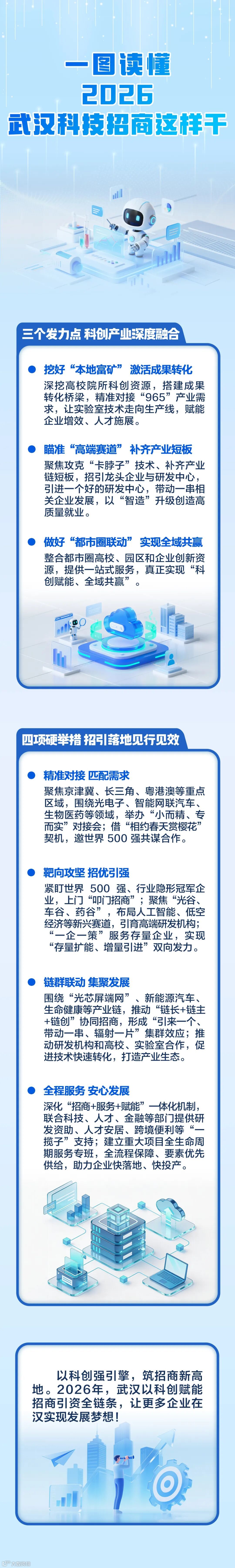 2月24日,武汉市人民政府新闻办公室举办2026年全市科技创新大会新闻发布会。武汉市投资促进局党组成员、副局长洪文胜介绍,武汉市投促系统正在充分发挥武汉的科教资源与产业基础双重优势,持续推动科技创新与产业升级深度融合,重点瞄准国内外龙头企业,大力招引其在汉设立研发中心和研发总部。一图读懂2026武汉科创赋能高质量招引怎么干。