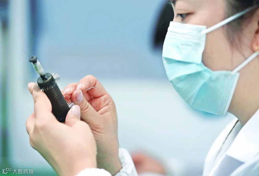 唯柯医疗工作人员用钢针穿引头发丝般的镍钛合金丝在磨具上编织心房分流器。
