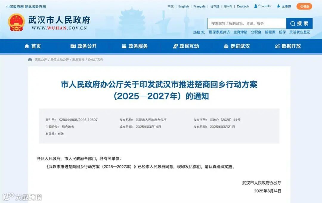 近日,《武汉市推进楚商回乡行动方案(2025—2027年)》(以下简称《方案》)正式发布。方案提出,全市每年新签约楚商投资项目不少于200个,落地项目不少于100个,产业到资金额不少于50亿元。