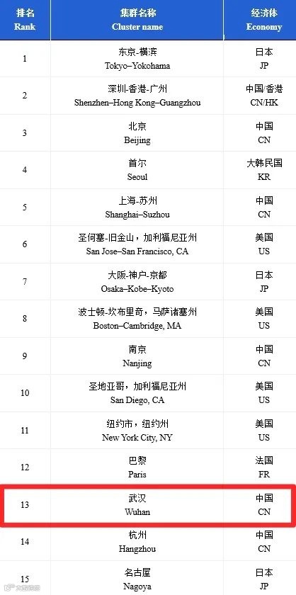 报告显示,中国连续第二年成为拥有全球百强科技创新集群最多的国家,今年26个城市科技创新集群进入全球百强,超过去年的24个。美国拥有20个全球百强科技创新集群,位居世界第二。德国有8个,印度和韩国各有4个。在更多中国城市进入全球百强科技创新集群的情况下,武汉仍然保持高位,显示了城市强劲的创新实力与活力。