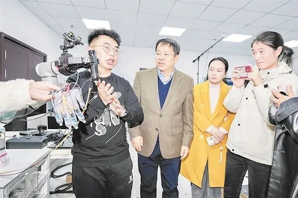 团队成员在一旁正在进行的实验,则更让人直呼科技感十足。只见一名工作人员用机械臂去抓杯子时,另一方的工作人员通过相关设备竟感受到了同样的抓取感。“这是6G技术的另一大应用场景,信息传输将实现多样化,不只是声音,触觉、嗅觉等都将能实现。”江涛说,这在电子商务和智能医疗等领域都将具有很大的潜力,比如顾客线上购买物品时,在线就可以触摸感受服装的材质。