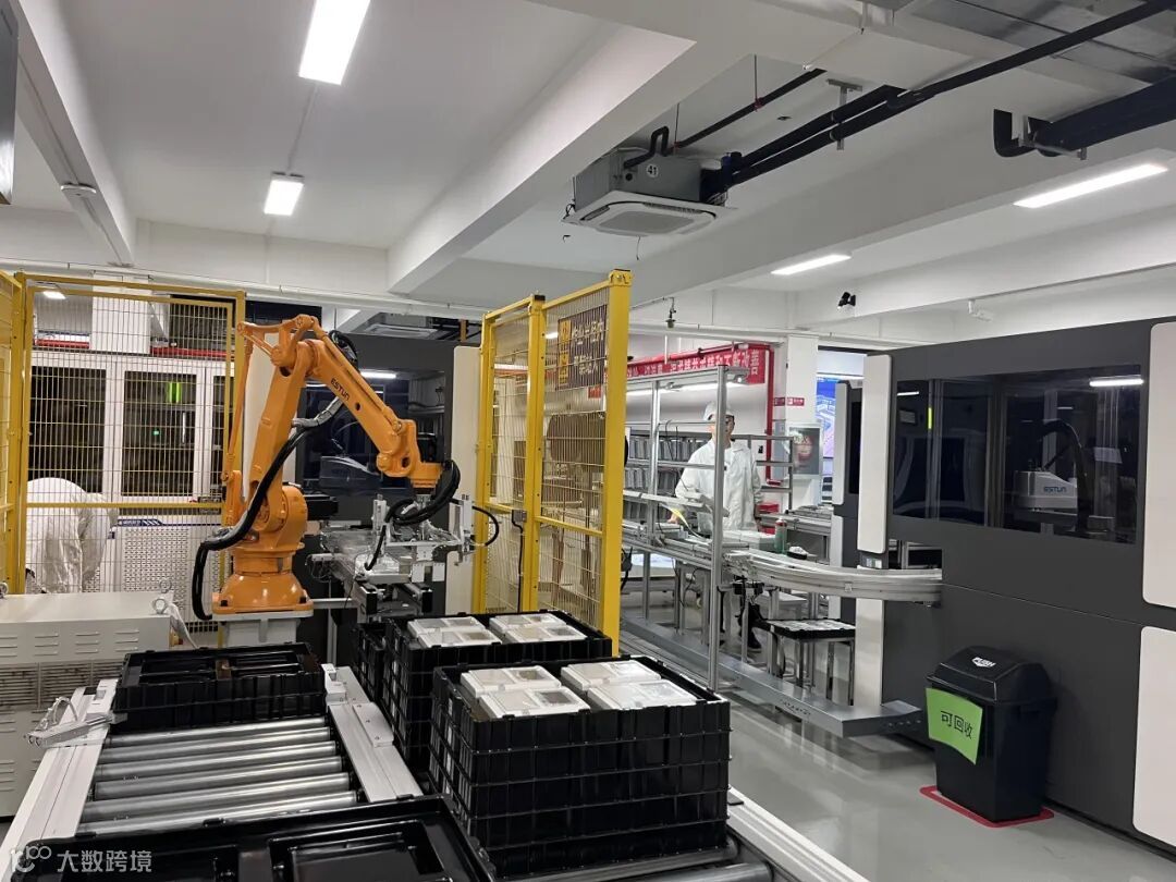 在车间里看自动化生产线,只见不同型号的AGV智能小车正将生产原料送到产线上,一个个机械臂正在进行精密生产,只在一些关键节点能看到工人的身影。