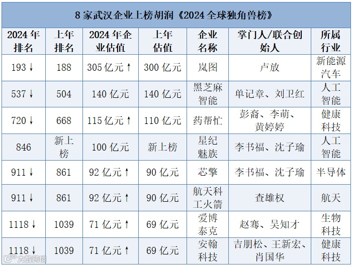 4月9日,胡润研究院发布《2024全球独角兽榜》,列出成立于2000年之后,价值10亿美元以上的非上市公司。340家上榜的中国企业中,9家来自湖北,其中武汉企业8家,比上年新增1家,独角兽企业数量在全国城市中位列第9。