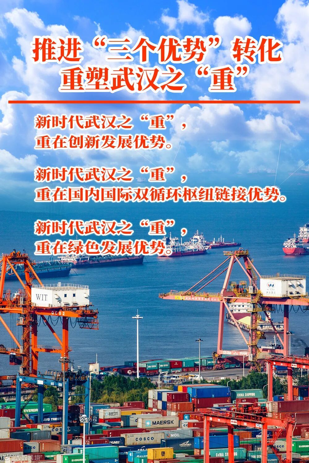 市委十四届六中全会提出:做好2024年经济工作要立足稳、着眼进,抓住一切有利时机,利用一切有利条件,看准了就抓紧干,掌握发展主动权。今年是新中国成立75周年,也是实施“十四五”规划的关键一年。重塑新时代武汉之“重”,正当其时,意义重大!