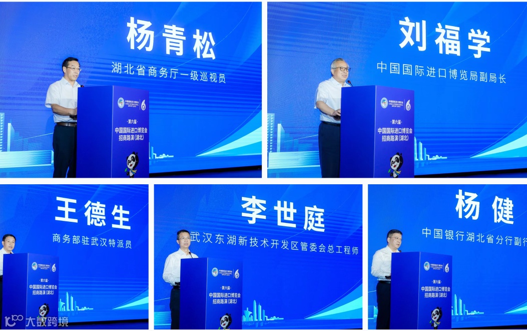 湖北省商务厅一级巡视员杨青松致欢迎辞,中国国际进口博览局副局长刘福学、商务部驻武汉特派员王德生、武汉东湖高新区管委会总工程师李世庭、中国银行湖北省分行副行长杨健发表讲话。