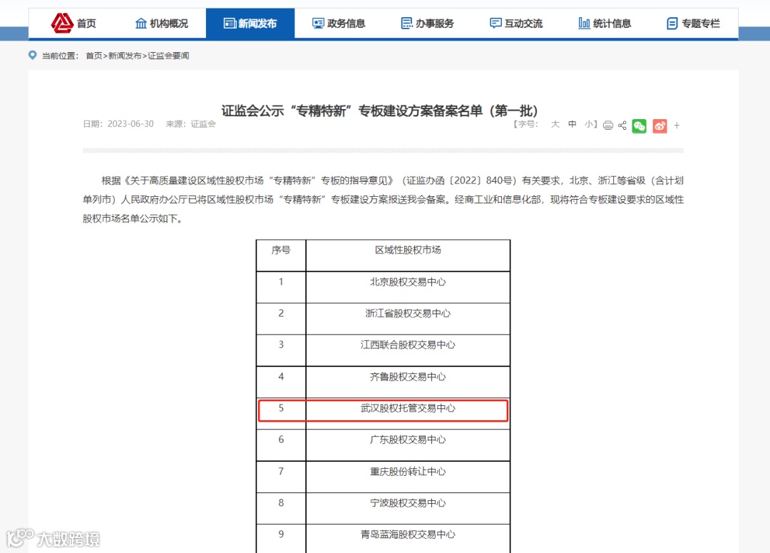 6月30日,中国证监会发布第一批“专精特新”专板建设方案公示名单,武汉股权托管交易中心(以下简称“武交中心”)等9家区域性股权市场入选,这意味着湖北“专精特新”专板建设方案正式通过备案。