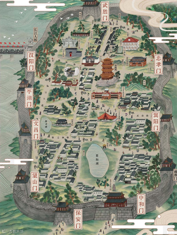 “一楼在守望,九门兴武昌”武昌城垣依山就势,合理利用地形地貌,在东南西北共开有九座城门,其中东有宾阳门、忠孝门,南有望山门、保安门、中和门,西边临江有汉阳门、平湖门、文昌门,北有武胜门,存续千年的精神脉搏根植在武昌深厚的历史土壤中绵延至今。