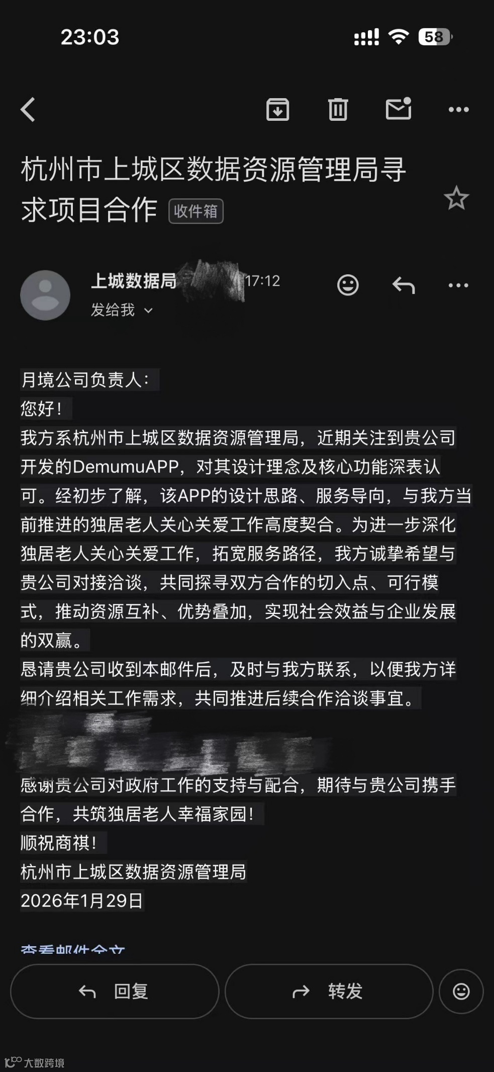 发件人是杭州市上城区数据资源管理局应用推进科科长孟慧君。邮件写得很长,很“用心”——不仅详细分析了他们产品的价值,写明了上城区能够提供的支持,更重要的是,对方把“能提供什么”和“他们需要什么”对应得清清楚楚。邮件末尾,附上了联系方式。