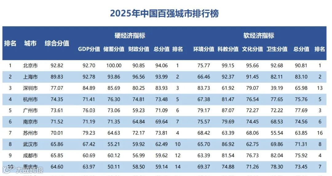 这些软硬经济指标,都有两个特点:首先是综合,因为每类分值都设置了许多细分指标,比如环境分值就包含建成区绿化率、固体废弃物处理率等,能够反映一个城市在某一维度的总体水平;其次是均衡,因为大量指标体现了人均的概念,比如储蓄分值和科教分值,都体现了人均储蓄、人均床位等水平。