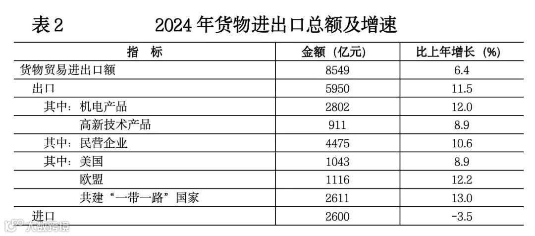 全年货物进出口总额8549亿元,比上年增长6.4%。其中,出口5950亿元,增长11.5%;进口2600亿元,下降3.5%。从主要出口市场看,对共建“一带一路”国家出口2611亿元,增长13.0%;对美国出口增长8.9%;对欧盟出口增长12.2%。机电产品出口增长12.0%,高新技术产品出口增长8.9%。