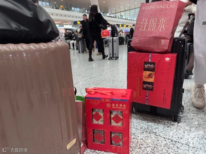 一对老夫妻带着砂糖橘和香飘飘奶茶,橘子缓解晕车,奶茶甜到心里;王女士手提佛跳墙礼盒,计划为年夜饭添惊喜。