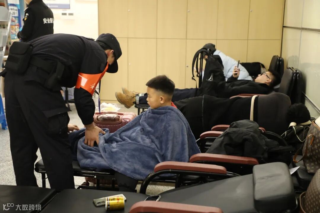 留宿点配备了应急医疗队,每个留宿点还配备2名警力通宵值守;行李寄存“安全岛”由专人看管并全程监控,安全守护不松懈;电子屏滚动播放列车信息,避免旅客误车。