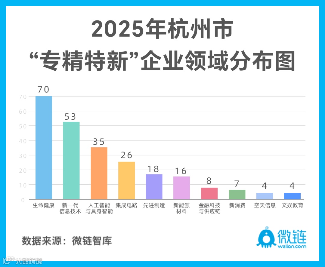杭州市“专精特新”企业领域中,生命健康领域仍以70家数量位居第一,新一代信息技术排名第二,企业数量为53家,人工智能与具身智能领域35家,集成电路领域26家,先进制造领域18家,新能源材料领域16家,金融科技与供应链领域8家,新消费领域7家,空天信息和文娱教育领域各4家企业。