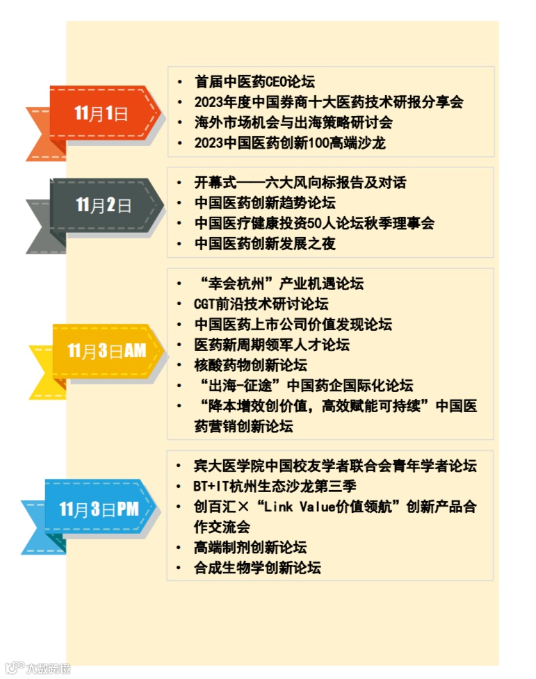 其中,11月3日举办的“幸会杭州”产业机遇论坛、“BT+IT”杭州生态沙龙、高端制剂+合成生物学创新论坛等活动,将围绕产业中“AI+诊疗”的未来趋势、高端制剂的产业化及合成生物学的应用等展开深入交流。