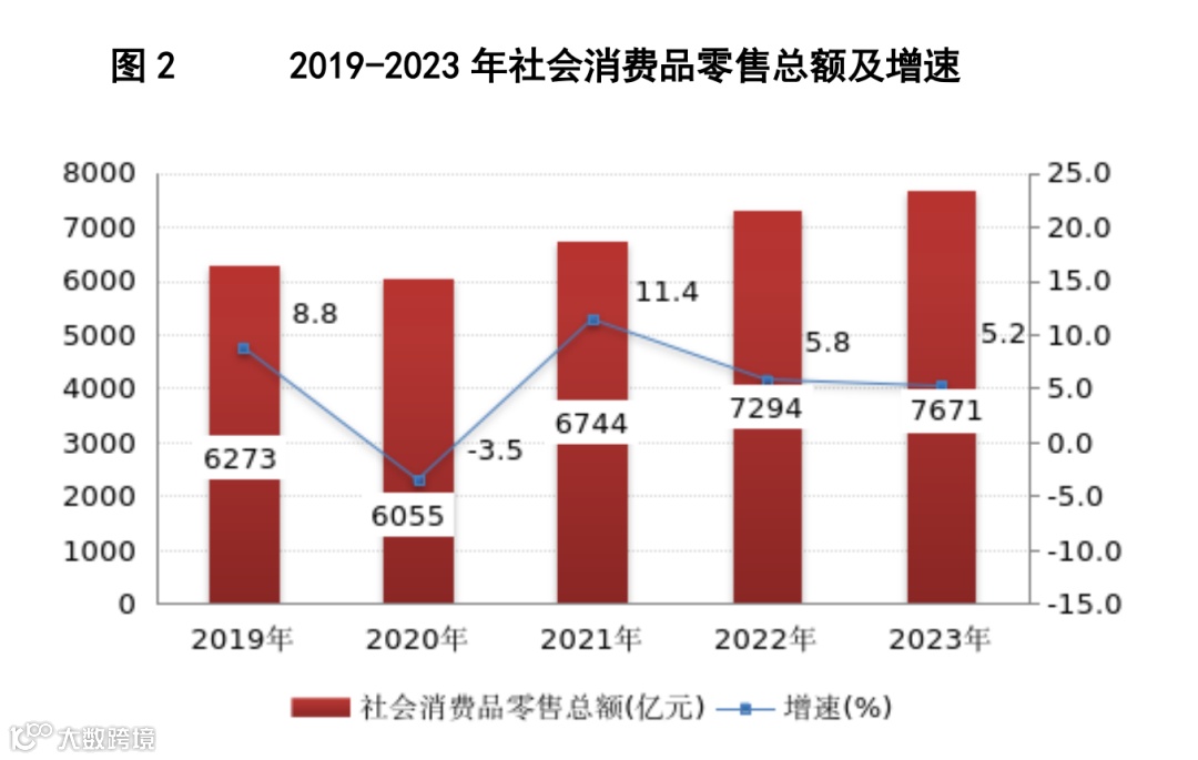 全年社会消费品零售总额7671亿元,比上年增长5.2%。按消费类型分,商品零售6350亿元,增长3.7%;餐饮收入1321亿元,增长12.8%。在限额以上批发零售单位商品零售额中,汽车类零售额增长2.1%,其中新能源汽车增长18.9%;石油类零售额增长2.2%;升级类商品消费增长较快,家用电器和音像器材类、金银珠宝类零售额分别增长24.2%和19.6%,可穿戴智能设备、智能家用电器和音像器材零售额分别增长93.7%和20.8%。限额以上批发和零售业单位通过公共网络实现的零售额增长9.5%。