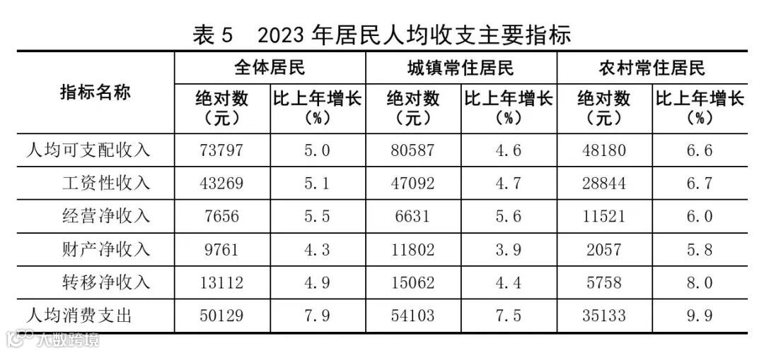 全年居民人均消费支出50129元,比上年增长7.9%。按常住地分,城镇居民人均消费支出54103元,增长7.5%;农村居民人均消费支出35133元,增长9.9%。