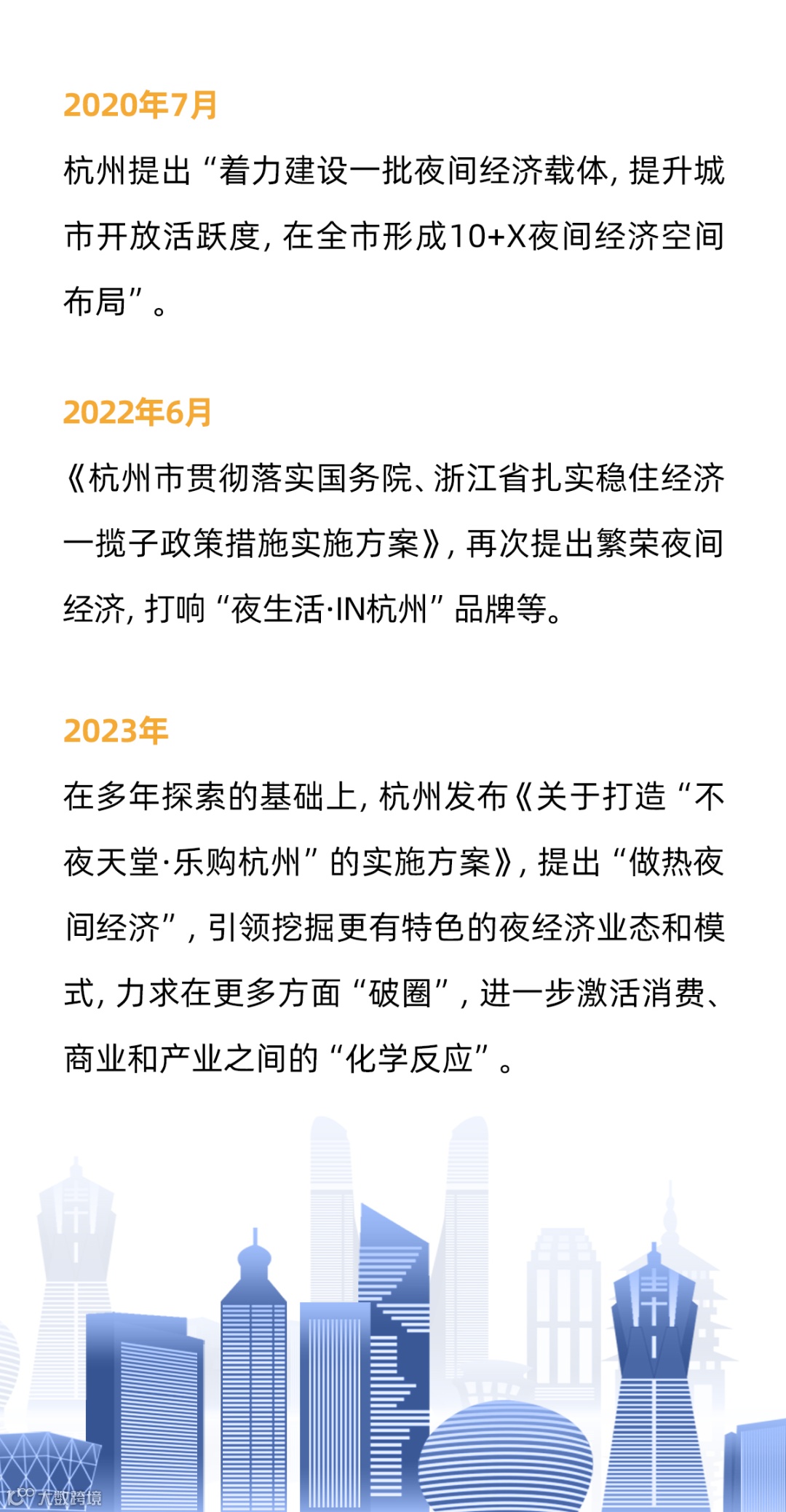 其后,杭州对西湖和运河等重要景观逐步实施夜景照明工程,建议商场和超市等延长营业时间,并于2007年打造了“印象·西湖”实景演出。之后又进行了一系列的探索和更新引导政策,意在打造“食、游、购、娱、体、展、演”等在内的多元夜间消费市场。