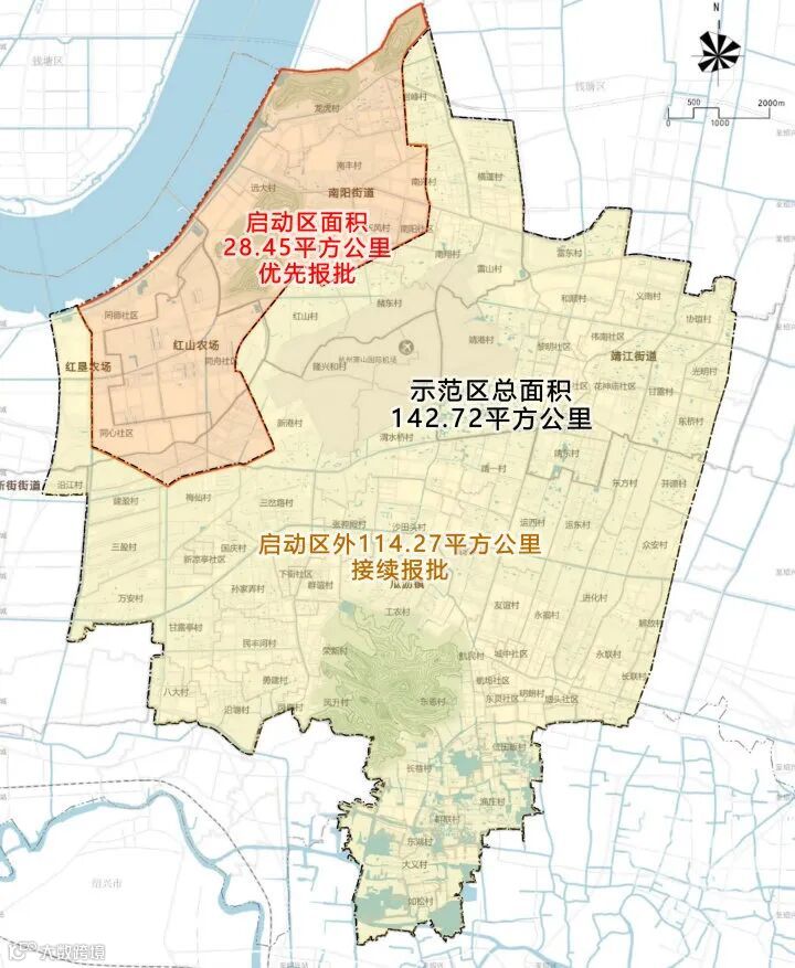 据悉,启动区规划面积28.45平方公里,其区域面积相当于一个“大钱江新城”。从区位上看,它处于萧山国际机场和钱塘江江岸线之间,从机场西大门的红山农场到观潮胜地南阳,形成一个字母C型的空间布局。