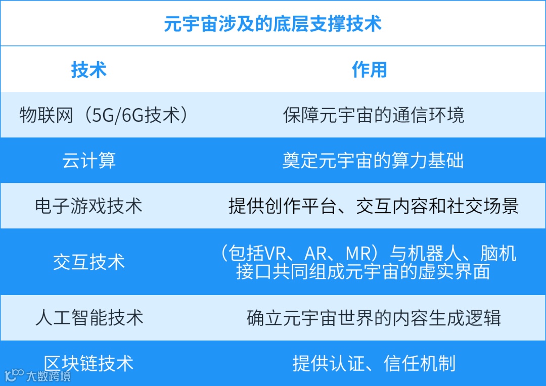 在元宇宙涉及的底层支撑技术方面,物联网是通信保障,电子游戏技术提供创作平台和社交场景,云计算奠定算力基础,交互技术是实现人机交互的关键,人工智能、区块链等技术则是元宇宙世界产生的核心技术支撑。