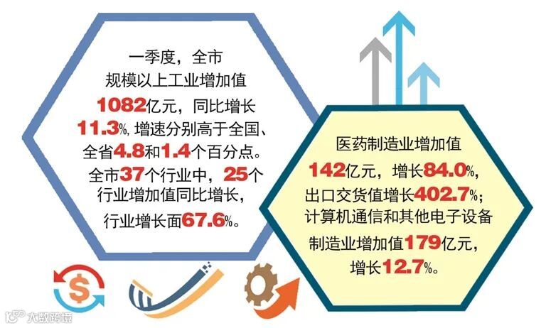 杭州统计数据表明,一季度,全市规模以上工业增加值1082亿元,同比增长11.3%,增速分别高于全国、全省4.8和1.4个百分点。全市37个行业中,25个行业增加值同比增长,行业增长面67.6%。