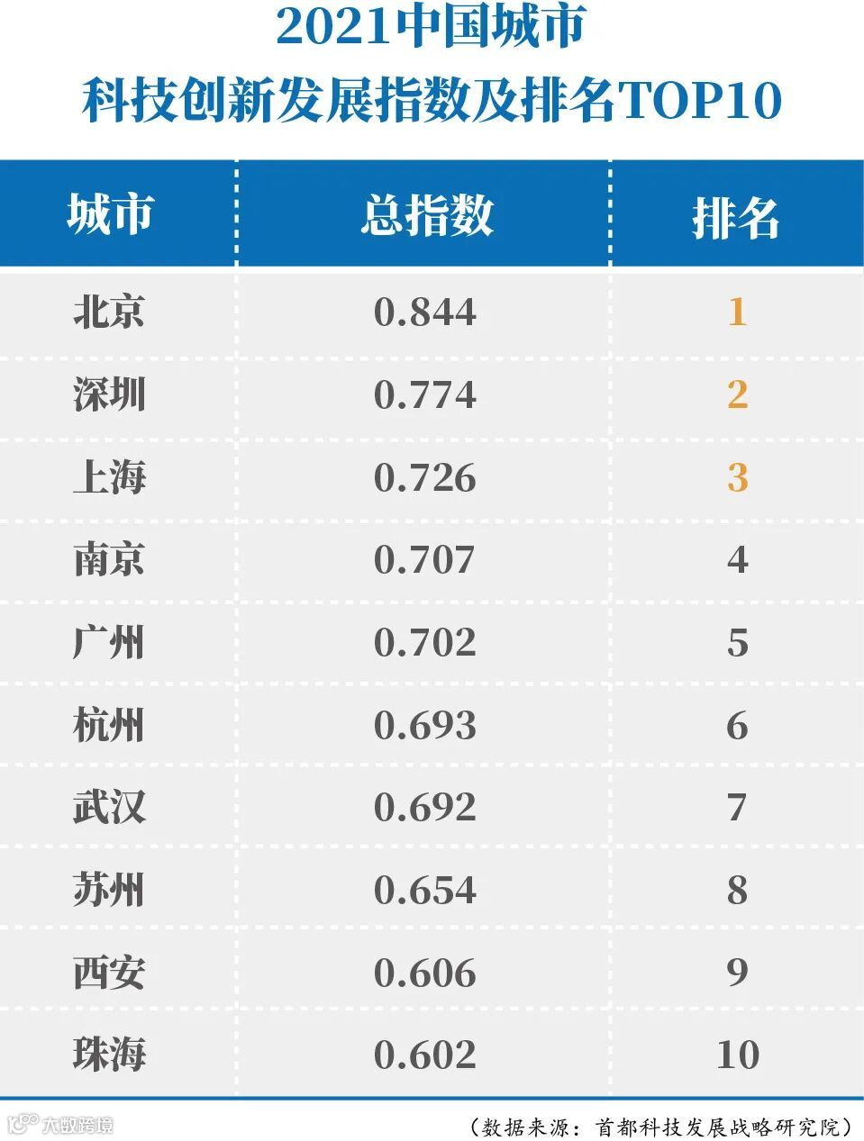 近日,首都科技发展战略研究院发布《中国城市科技创新发展报告(2021)》(以下简称报告),对中国288个地级及以上城市的科技创新水平进行评估。结果显示,2021年度中国城市科技创新发展指数排名前10位的城市依次是北京、深圳、上海、南京、广州、杭州、武汉、苏州、西安、珠海。杭州位居全国第六。
