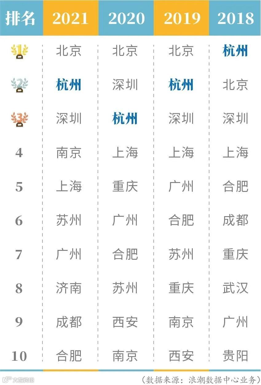 梳理近几年的排名来看,杭州始终位列榜单前三,显示出强大的产业实力。