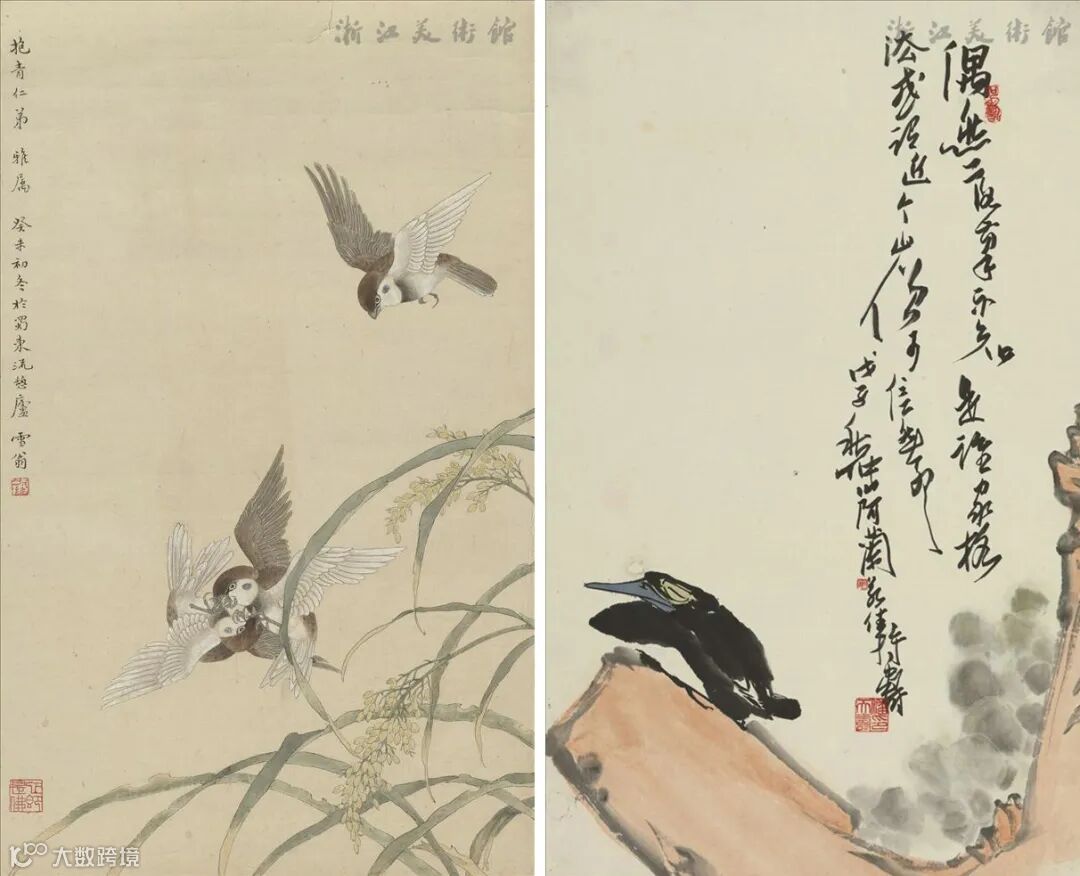 ▲ 左图:陈之佛《斗雀图》;右图:潘天寿《孤独的鸟》(图片来源:浙江美术馆官网)