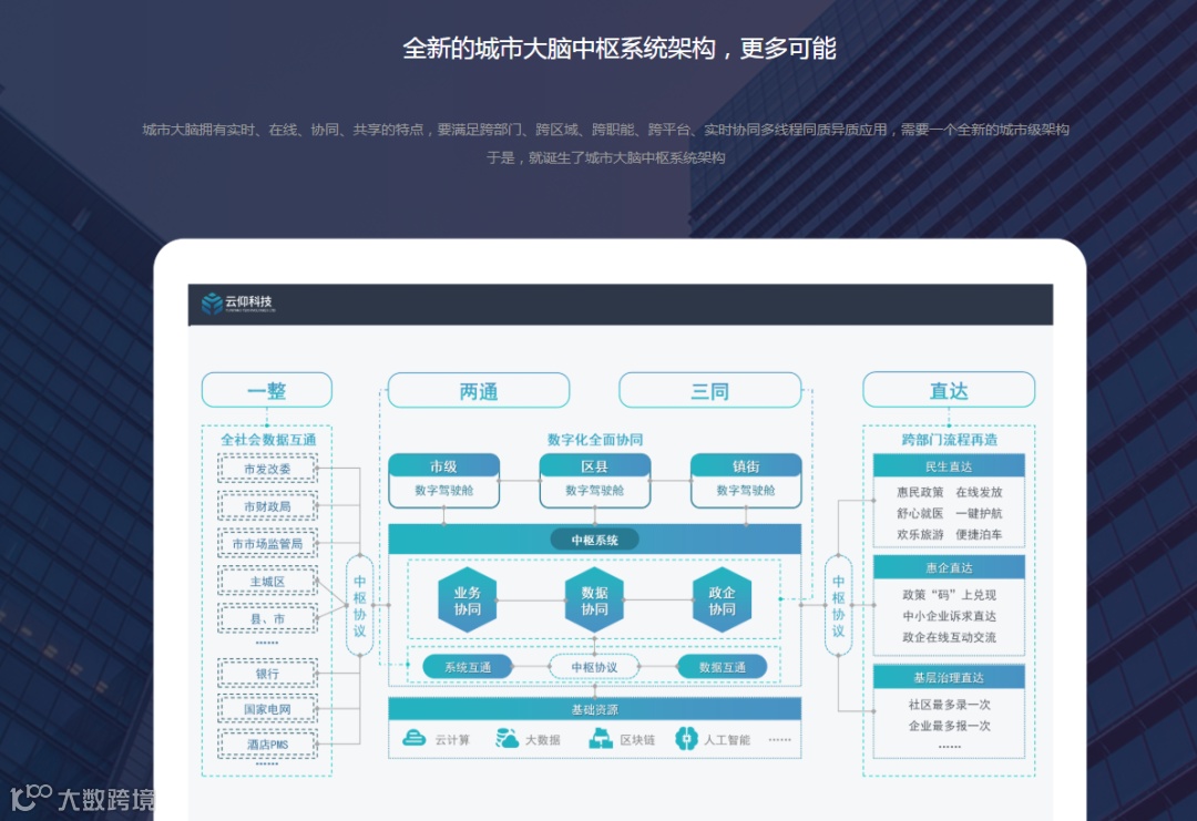 “‘城市大脑’和之前提出的智慧城市有着本质区别。”分析人士告诉投促君,“城市大脑”是一种自上而下的城市管理方式变革,不再聚焦于解决某个职能部门的问题,而是聚焦在城市问题的本身,通过数据的流动和协同的方式构建数字驾驶舱和具体应用场景,以实现民生直达、惠企直达、基层治理直达的城市治理功能。