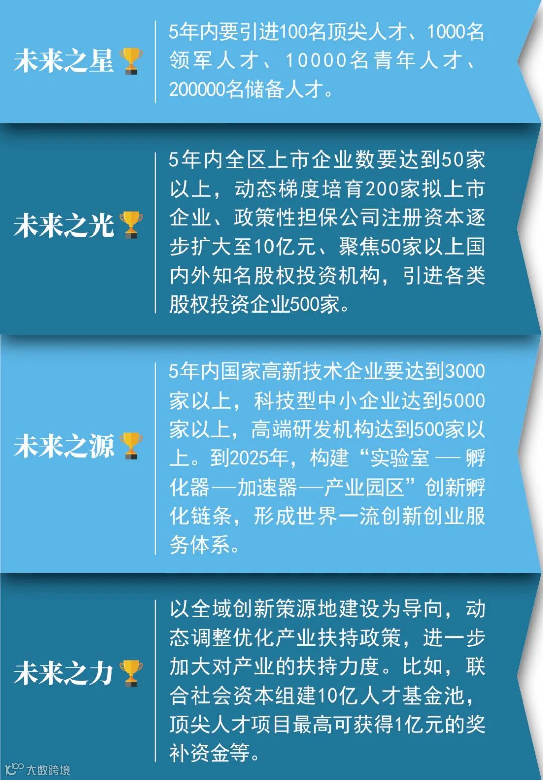 据了解,“翱翔计划”分为“未来之星”“未来之光”“未来之源”和“未来之力”四部分,涵盖了人才引育、金融服务、产业扶持、大孵化器建设等服务创新发展的多项具体措施。