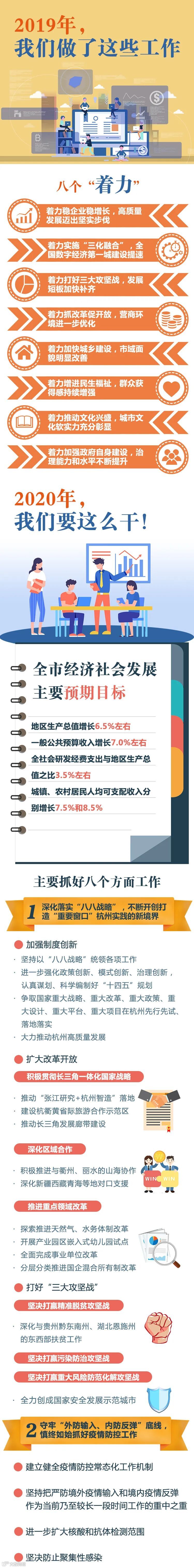 今年政府工作总体要求是:高举习近平新时代中国特色社会主义思想伟大旗帜,认真学习贯彻习近平总书记在浙江、杭州考察时的重要讲话精神,全面落实中央和省委、省政府决策部署,按照市委部署要求,坚持稳中求进工作总基调,坚持新发展理念,坚持一张蓝图绘到底、一任接着一任干,坚定不移“干好一一六、当好排头兵”,统筹推进“战疫情、促发展”,加大“六稳”力度,做好“六保”工作,大力提振服务业,持续做强数字经济和制造业高质量发展“双引擎”,拓展都市经济、幸福经济、未来经济三大新蓝海,推进新基建、新消费、新制造、新电商、新健康、新治理,着力补短板、堵漏洞、强弱项,积极探索具有杭州特点的大城市治理现代化新路,确保高水平全面建成小康社会和“十三五”规划圆满收官,奋力在我省打造“重要窗口”中走在前、作示范。