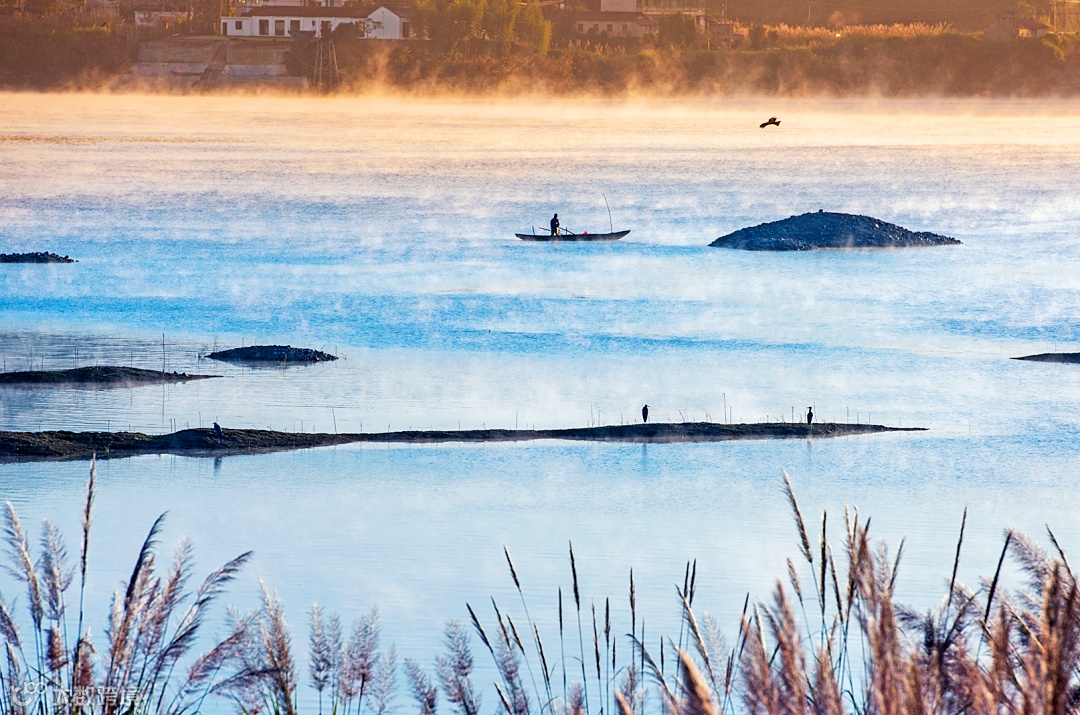 春来看雾,夏来赏鱼,秋看落霞与孤鹜齐飞。在淳安西南面的五堡村附近,有一片辽阔的湿地——安阳湿地,这里自然风光优越,一如诗云:“水畔暮山衔夕阳,归舟返棹暮霞光。”