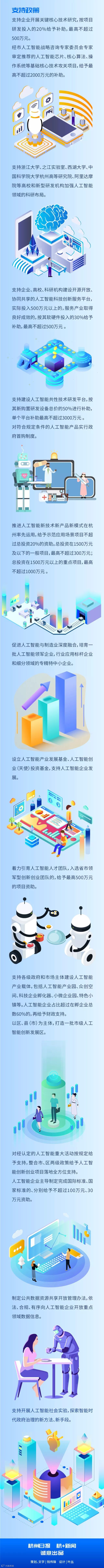 在支持人工智能基础理论研究和关键核心技术研发上,杭州将在市基础研究资金中重点支持人工智能领域的基础理论研究,并在市重大科技创新计划项目中设立人工智能专项,支持企业开展关键核心技术研究,按项目研发投入的20%给予补助,最高不超过500万元。