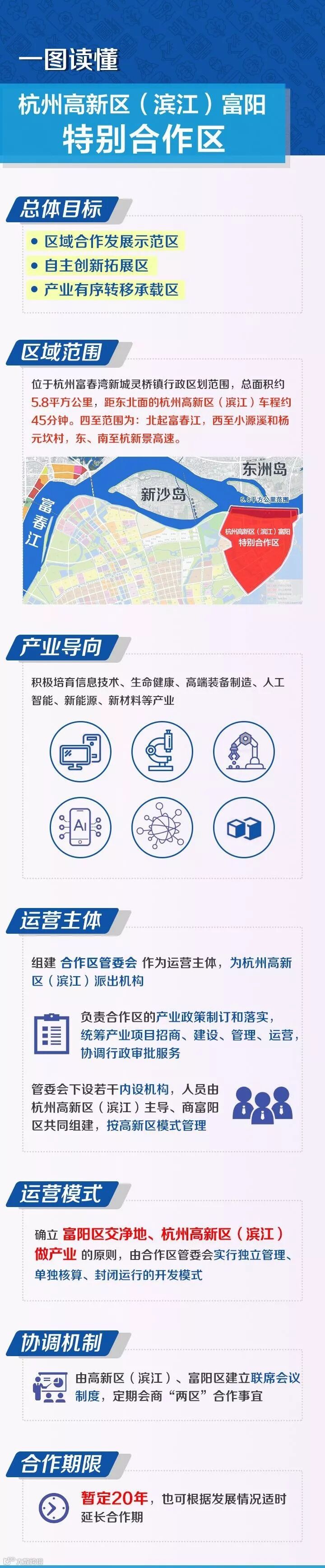 产业导向上,将积极落地符合高新产业导向的项目,培育信息技术、生命健康、高端装备制造、人工智能、新能源、新材料等产业;高新区(滨江)重点负责产业招引、产业培育、项目落地,富阳区负责征地拆迁、基础配套、社会治理等事项。