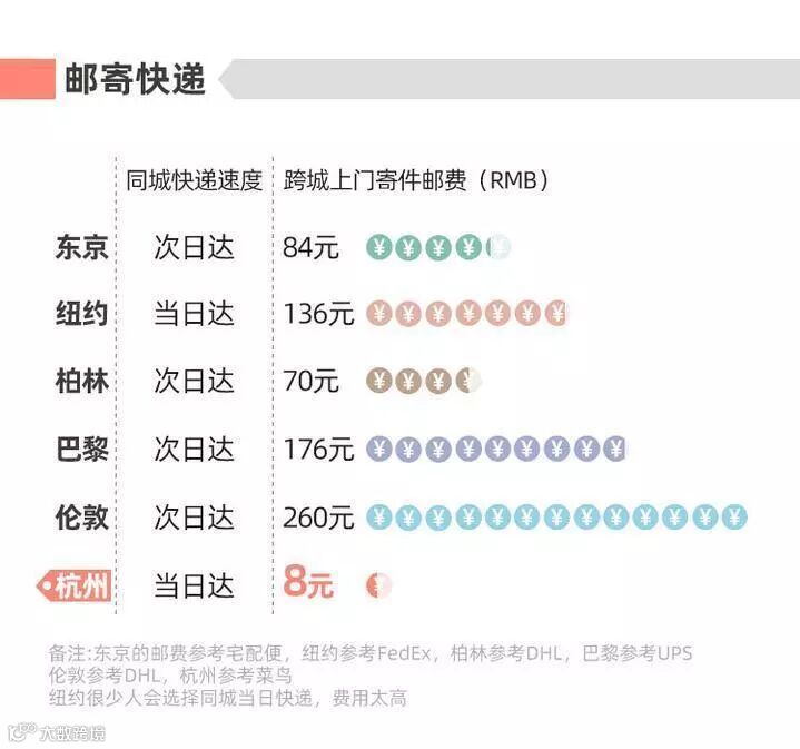 至于邮寄快递、外卖预订等服务,六座城市的便捷度总体相差不大,但是所需费用相差悬殊,其中同城快递、闪送等配套业务在五座国际城市中的水平远不及杭州。比如在纽约、柏林、巴黎,快递上门取件都需要额外支付服务费,并且在上门收取包裹并跨城快递的收费情况比较中,即使是价格最低的柏林,邮费折合也需要至少人民币70元。相比之下,杭州的快递费用仅为8元,几乎是柏林的十分之一。