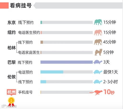 在看病就医方面,纽约、柏林、伦敦的居民主要是通过电话医生来进行预约,等待时间短则5分钟,长则1天,甚至在伦敦,如果病情不紧急,可能要到一个月以后才能就诊。在杭州,各类医院大都已经开通手机挂号服务,只需就诊前在手机上进行简单操作即可挂号。既免去了传统排队损耗的大量时间,又能帮助医院有序安排病人尽快就诊。